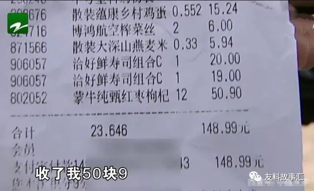 但是购物小票上面显示,结账的时候收了她50块9,多收了11块。
