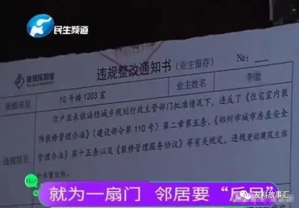记者在现场也发现,禹女士邻居家的屋门上,确实也贴有物业给出的违规整改通知书,上面并没有说明具体的违规整改项目是否和屋门外开有关。