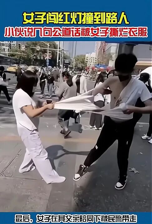 男子全程没有动手,女子拉住男子的衣服,直接将男子的衣服撕烂,这一幕又被其他围观群众拍到,并且发到网上,有热心的路人帮忙报警,民警到场后直接将女子带走,女子这时候还大声哭喊“我没有撞人,你们冤枉我,我是小仙女,怎么可能撞人”
