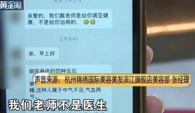 最后任女士通过语音电话联系上了店里一位张经理,张经理表示,她们的老师不是医生,只是来调理亚健康为主的,做美容的话是有专门的美容师来做,开穴位的有开穴位的资格证。不过任女士表示,那位戴老师是操作仪器的,并不是人体按摩师,而且自己也咨询过相关的医生,讲道理来说是没有资格按摩的,当任女士提出自己的3千块钱是消费在哪里的时候,这位经理直接以接电话为由挂了通话。