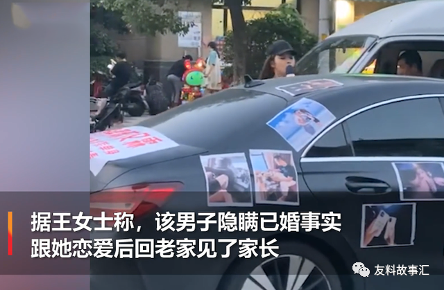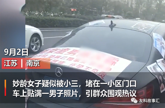 南京新城香溢紫郡附近,一辆奔驰车被贴满了女子跟另外一个男人的合照,不乏一些私密的照片。旁边一名打扮时尚的妙龄女子正喊麦渣男出来解决问题,引起了众多群众围观。