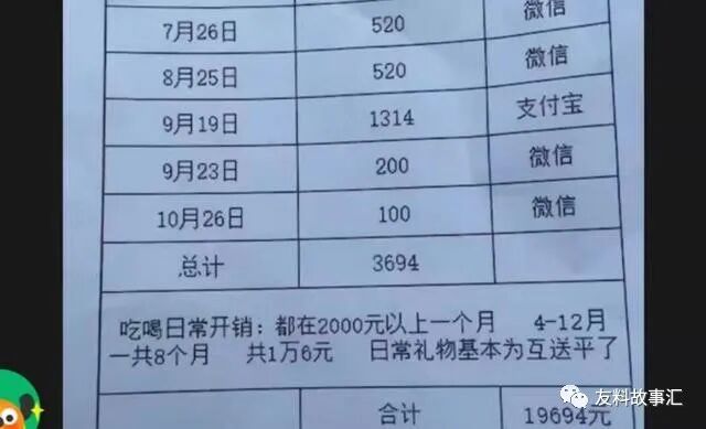 2020年4月份到12月份,桐城女孩小汪和前男友经历了恋爱到分手的过程。前男友竟然列出了详细的恋爱消费清单,我们来看看有哪些!第一部分是红包类的转账,一般都是520、1314还有一些100-200的数字表达什么也不清楚。转账的这个钱那估计得退回了。第二部分是日常吃喝开销,男生心很细,每个月2000元以上,一共8个月共计1.6万元。个人觉得这个1.6万元这个得平摊吧!如果全是女方一个人吃得那么就无话可说。剩下的就是人情世故见家长的礼物,这个又是一个大头。这8个月来给老丈人以及女方家的礼节,香烟酒之类的,随礼的钱、接待女方家人住酒店吃饭的钱,这些零零碎碎加起来3-4万元。前男友一通列出了大概5.7万元的费用,这么算下来是不少哈!不到八个月就花费了6万元,谈恋爱真的费钱啊!