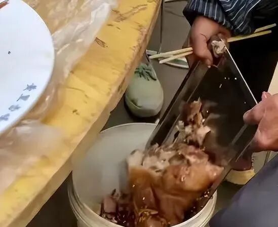 但是,让刘女士没想到的是,热乎的菜刚一端上桌子,众人还没有拿起筷子开吃,一旁的老大爷便直接端起好几个盘子,将才上桌的菜全都倒进了他事先准备好的塑料桶里。