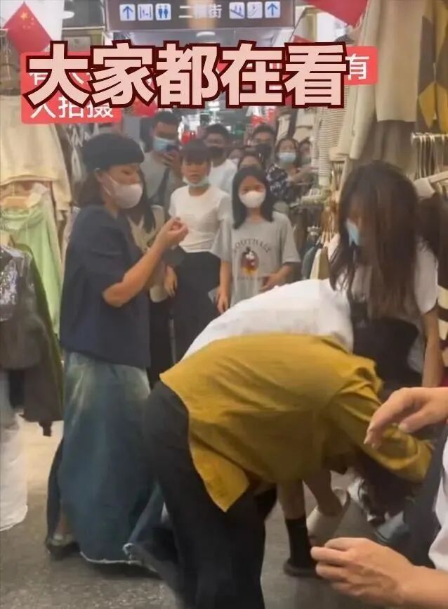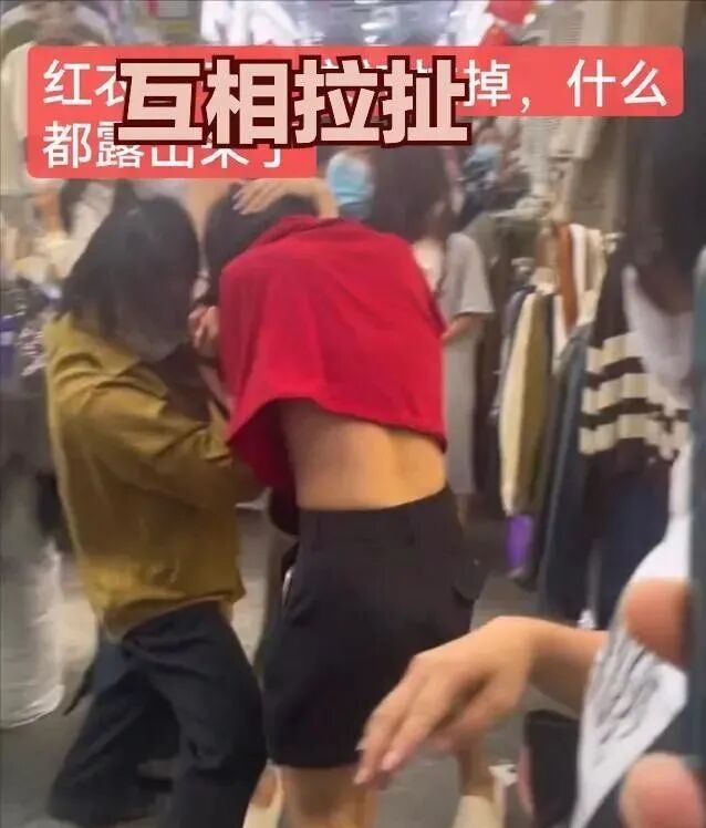 现场一片混乱,有人在看热闹,有人在拉架,也有人在拿出手机不停拍摄。狭窄的服装市场挤满了人,大家都想知道到底发生了什么。这条街上的商户仿佛是见惯了这样的场景,说这两个售货员,八成是因为生意打了起来。