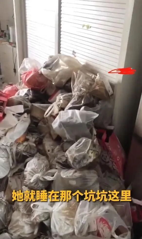 房间里的垃圾已经堆成了一米多的垃圾山,各种塑料袋、外卖盒、饮料瓶堆满了房间的每个角落。本来宽敞的房间里摆了一张两米一的双人床,如今已经被垃圾彻底掩埋,只留一个能容一人躺下的窝窝,女孩平日就在这个窝窝里睡觉。
