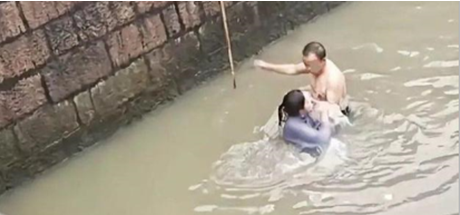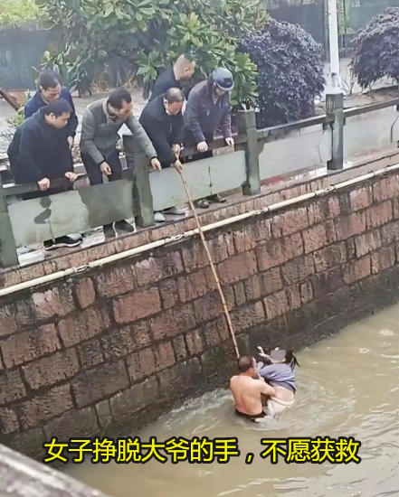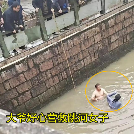 事情还得从网上一段视频开始说起,视频中一名女子在河里寻短见,另一名大爷见状马上跳下河营救女子。