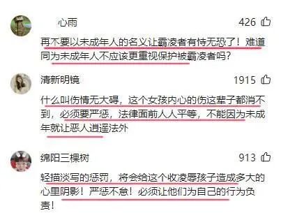 从三人说自己是未成年人,受害者报警无用,就能知道他们实施暴力霸凌的根源是什么?他们比很多成年人还了解未成年人保护法,就像一些家长教育孩子那样,把法律法规当成作恶不受处罚的保护墙,实在让人无语。