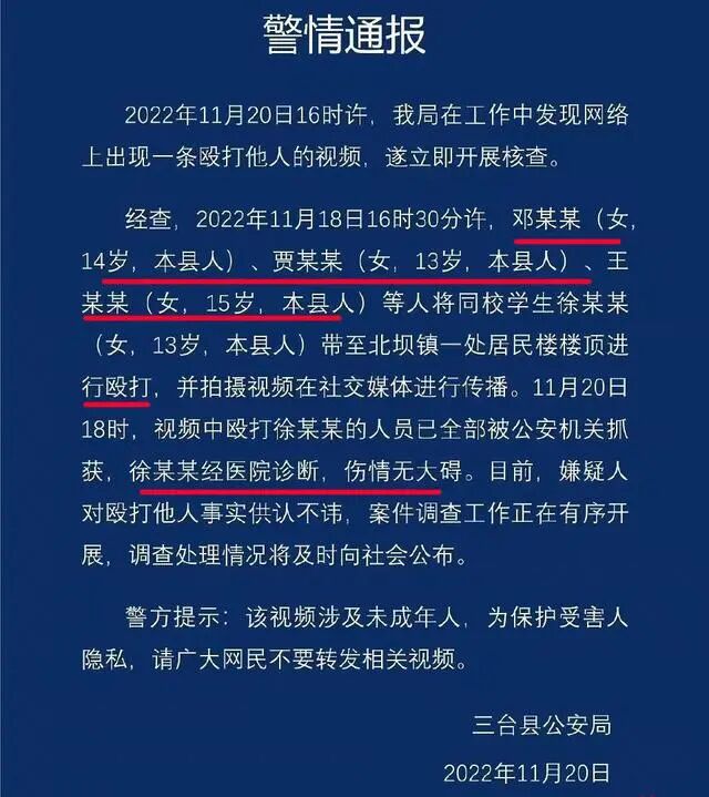 视频曝光后引发很多网友愤怒,3个人欺负一个小女孩实在是很不道德,11月20号晚上,三台县警方发布了通报,称经过调查,已经将打人者全部抓获,嫌疑人对打人事实供认不讳,受害者经医院诊断,伤情无大碍。
