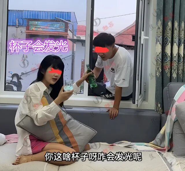 女子照着男子的说法喝光了杯中酒,果然灯光熄灭了,后来男子又把酒瓶子递给女子“嫂子你把酒倒进去,水杯就会发光,喝掉里面的水,被子就熄灭,不信你试试”