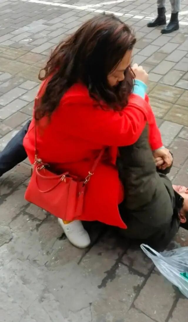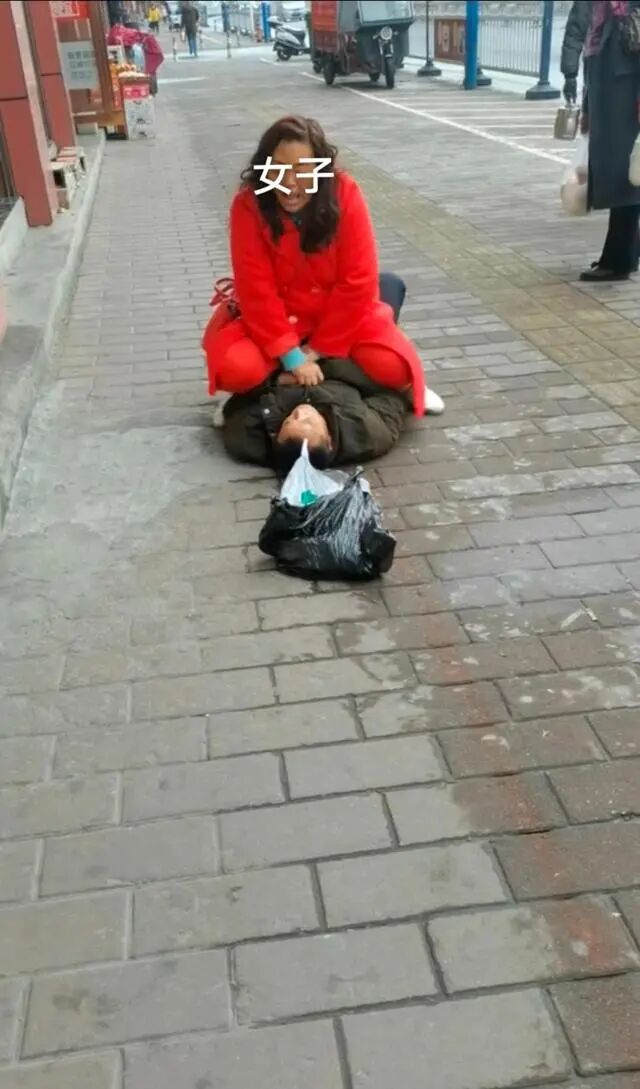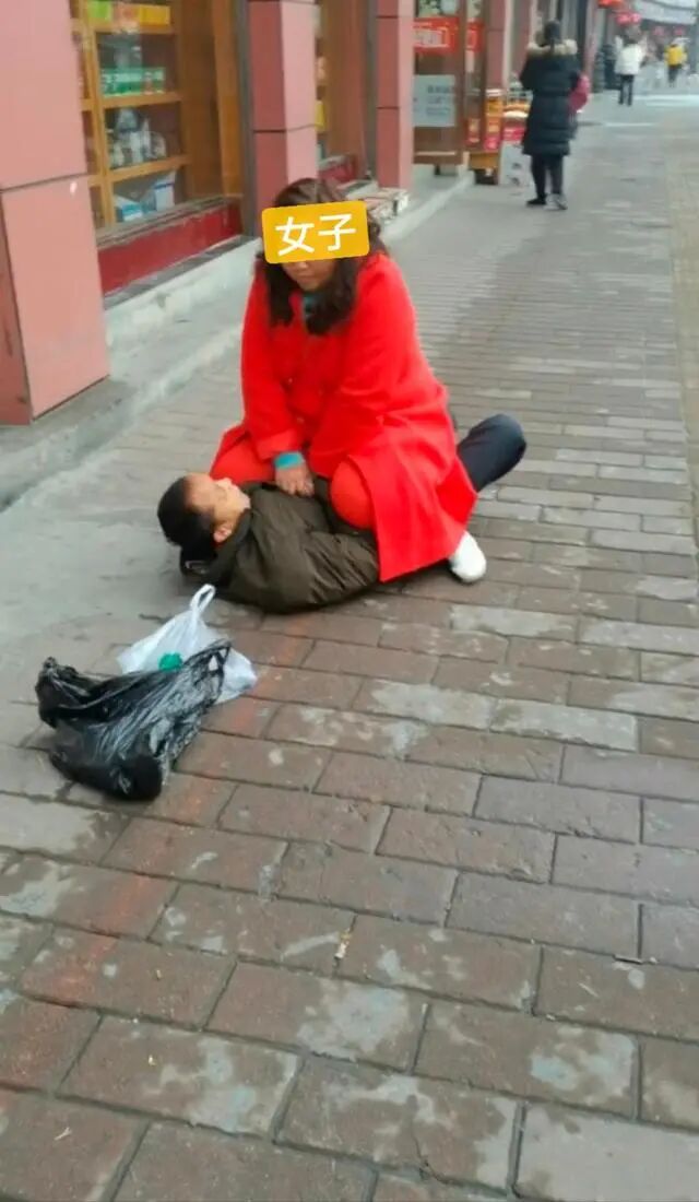 围观的群众有人忍不住笑了,一个大男人被女人按到地上,竟然喊救命?