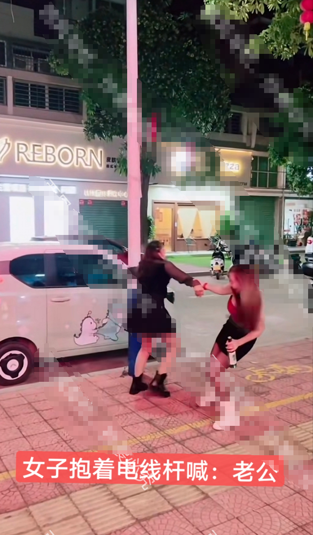 但是喝了酒的人,最怕迎风吹,这三名女子走到街上,刚刚走了一半路程,迎风一吹,酒意上涌,竟然走不回去了。一个女子说想老公了,说着说着,跑到路边抱着电线杆喊老公,还摇摇摆摆磨磨蹭蹭,可能是恍惚中产生了幻觉,把电线杆当成了自己老公。