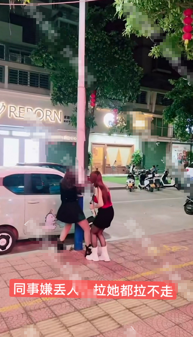 另一个女子看见有路人在围观,赶紧去拉她,结果女子抱着电线杆,拉都拉不走,最后蹲在地上哭了。