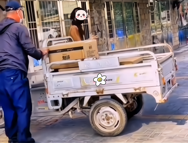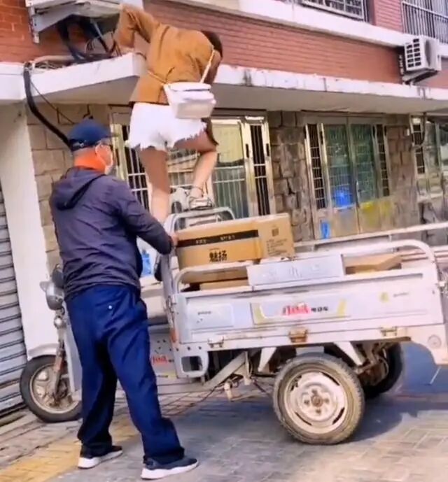 大爷把三轮车停到楼下,示意女子往三轮车上跳,女子反复调整方向,就是不敢下去,大爷连忙伸出手,托着女子的脚,这才让女子跳到了车子上。