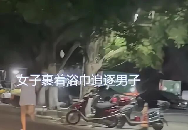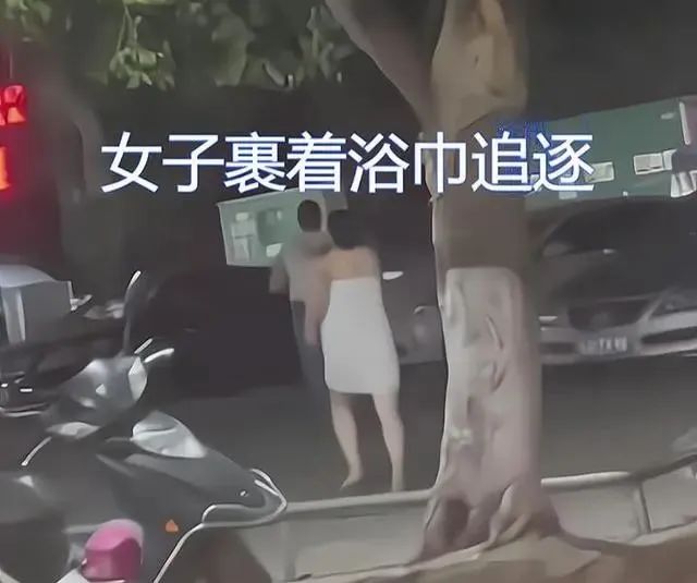 在曝光的视频里,一位女子身上裹着浴巾,拼命的追逐一位男子,边嘴边喊着: