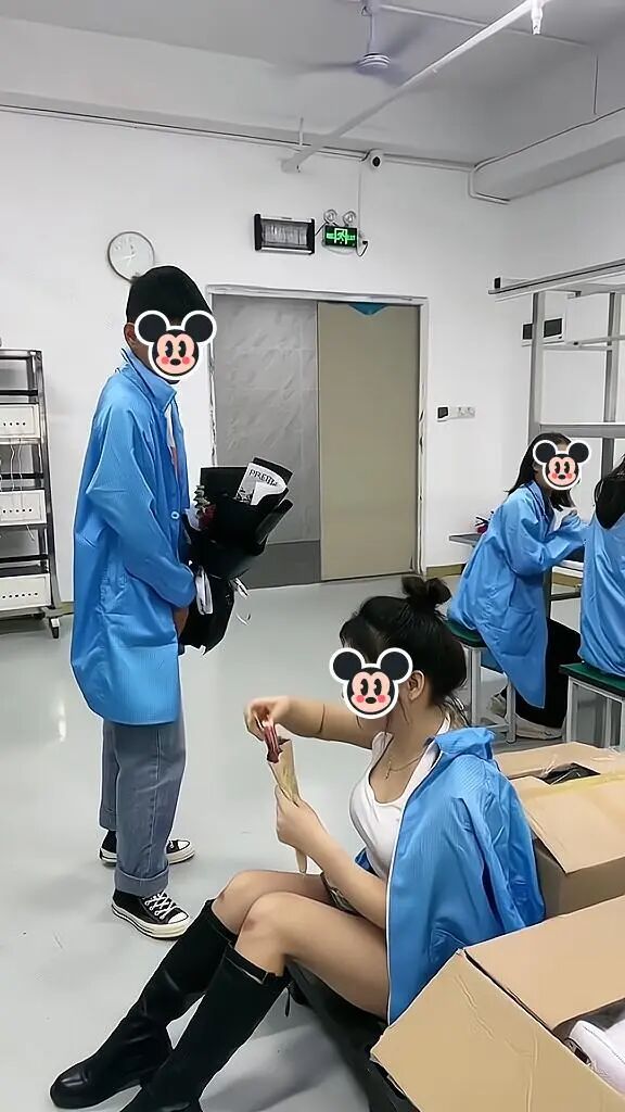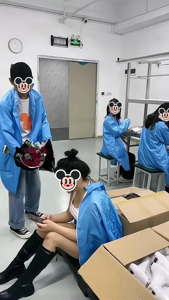 他手持一束玫瑰花,来到女子所在的车间。当时女子在低头玩手机,没有注意他来到自己的身旁。