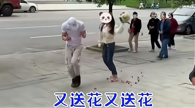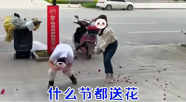 男子不知道自己做错了什么,战战兢兢地把花送过去,女友连看都不看,拿起花就往男子身上摔打,打的男友连连后退。