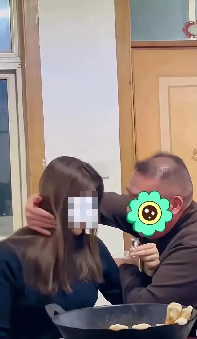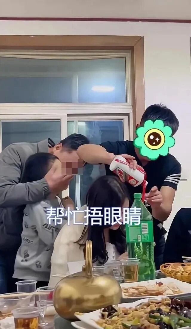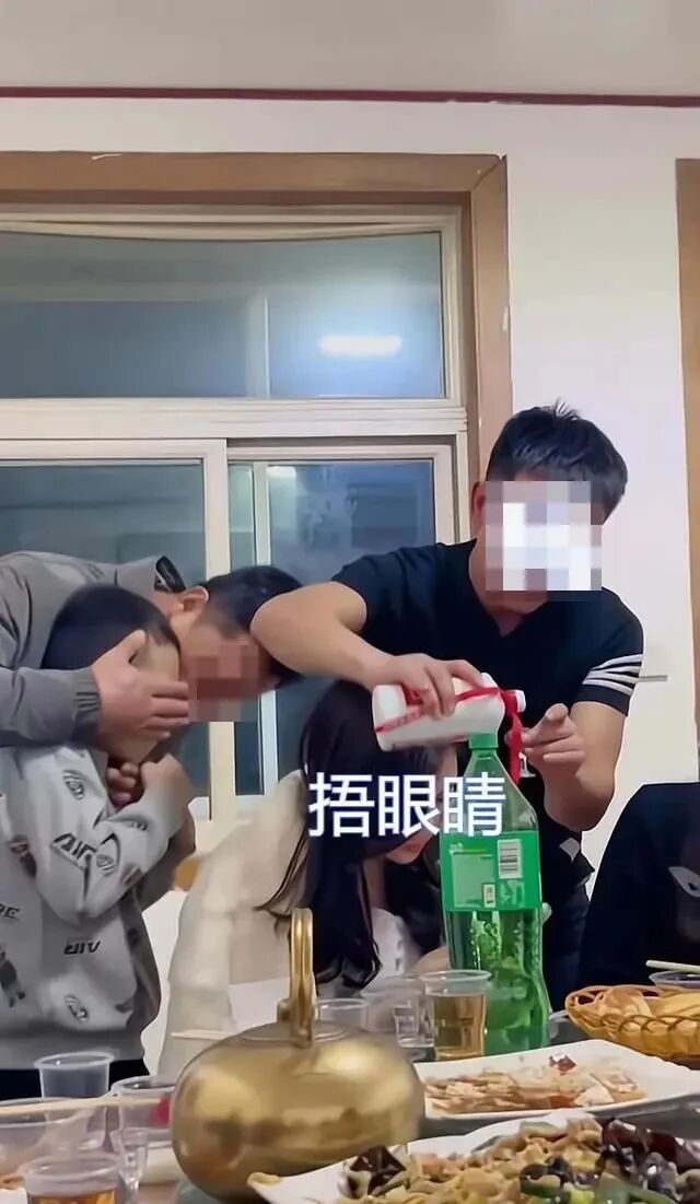 帮忙捂眼睛的同学,虽然情商很高,美其名曰是做游戏,让孩子猜猜“我是谁”,不至于显得突兀,而就在这个捂眼睛的过程中,现场的女子和边上的男同学,快速的喝完了杯中酒。