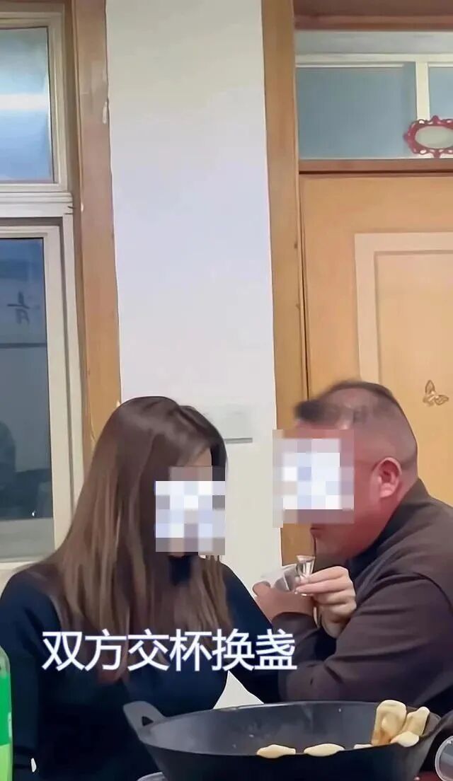 挨着女子坐的男同学,看上去发福的样子,似乎像是“成功人士”,获得了这位身材和面容较好的女子青睐。两人交杯换盏,最终女子半推半就,和男子也交了杯。
