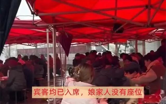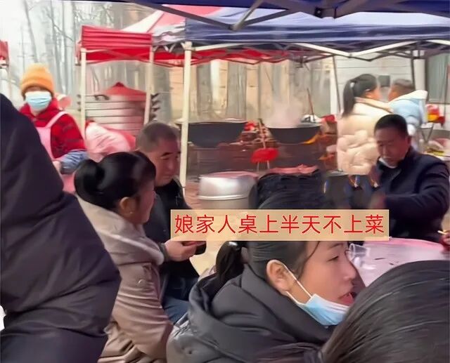 好在公公这边看到情况不对,赶紧叫人搬来了桌子,在棚子外面临时搭了一桌。可是棚子里面别的桌都已经上了满满一桌菜了,而娘家人这一桌却半天没上一个菜。