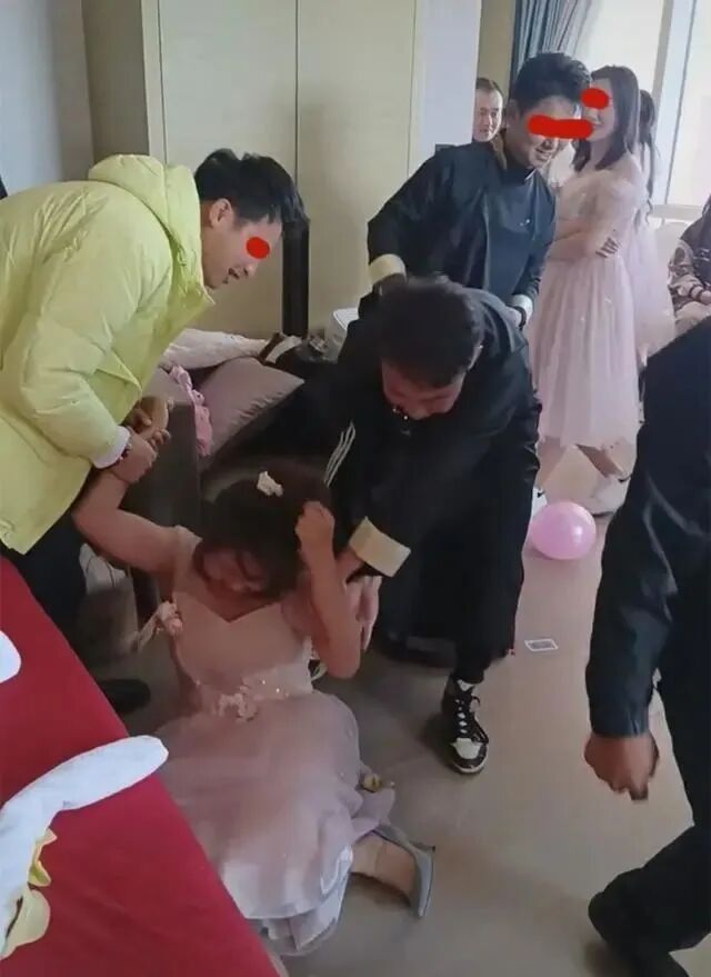 爬起来之后,伴娘坐在地上休整了半天都没力气站起来,而旁边的男人们却告诉她:“为了你的好闺蜜,婚礼闹得越惨,祝福才会越深。”