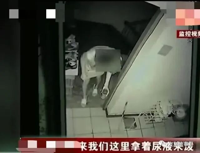 一个穿着睡衣拖鞋的女子,手里拿着一个杯子,里面装满了尿,出现在楼道里。只见她先是探出头,仔细观察周围情况,确定没有人看到后,她把手里的尿都倒进了谢先生的鞋子里。