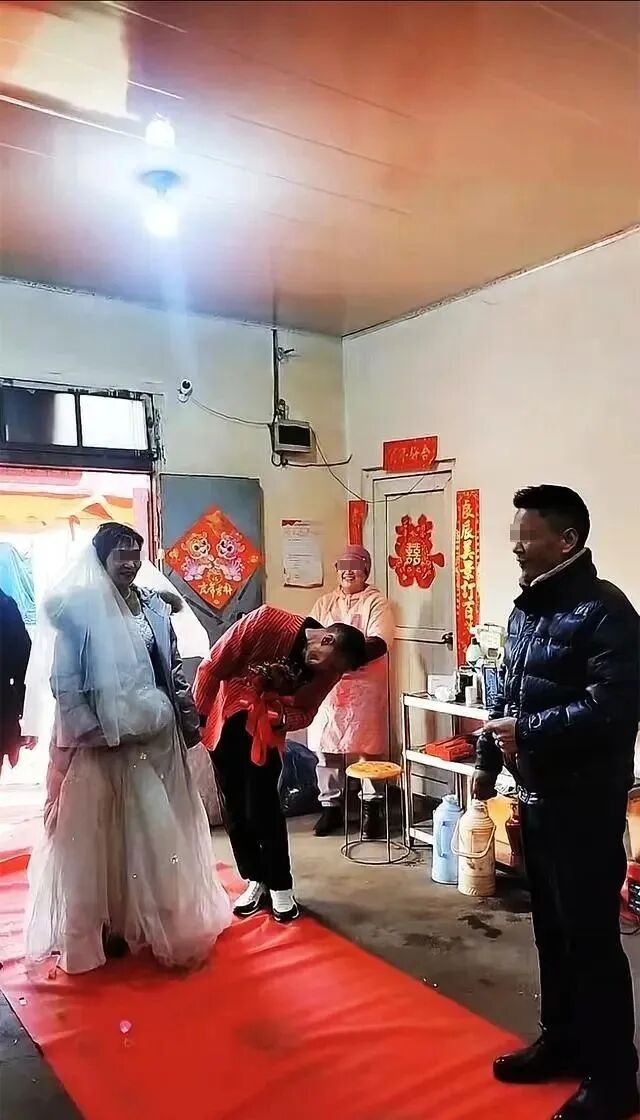 新郎生下来身体就有些残疾,腰部脊椎出了问题,头部一直处于弯曲状态,无法抬起头来,外在形象的差异让他没少受苦。
