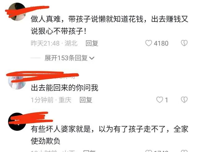 有网友评论说,做人真难,带孩子说好吃懒做就知道花钱,出去赚钱又说狠心不带孩子。