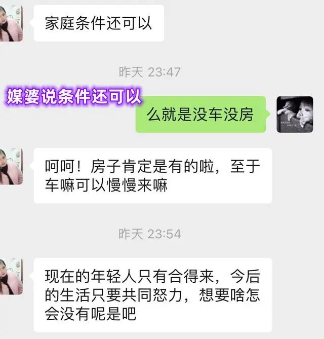 也就是说,没有房子和车子,结婚后,两个人一起努力工作,一起建房子买车,也很励志。