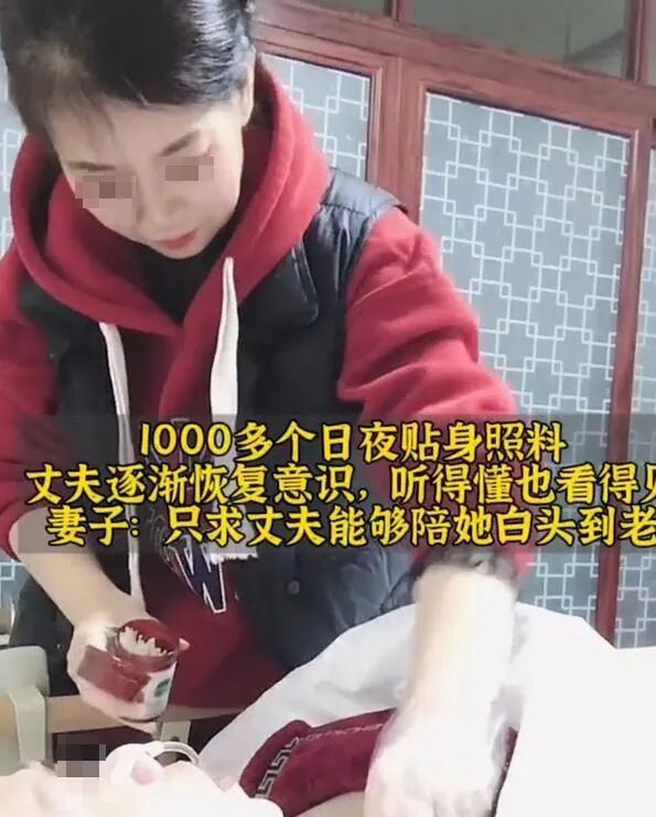 经过一千个日夜的贴身照顾,丈夫终于恢复意识,能够听得懂,也能看得见,女子的辛苦也算没有白费。