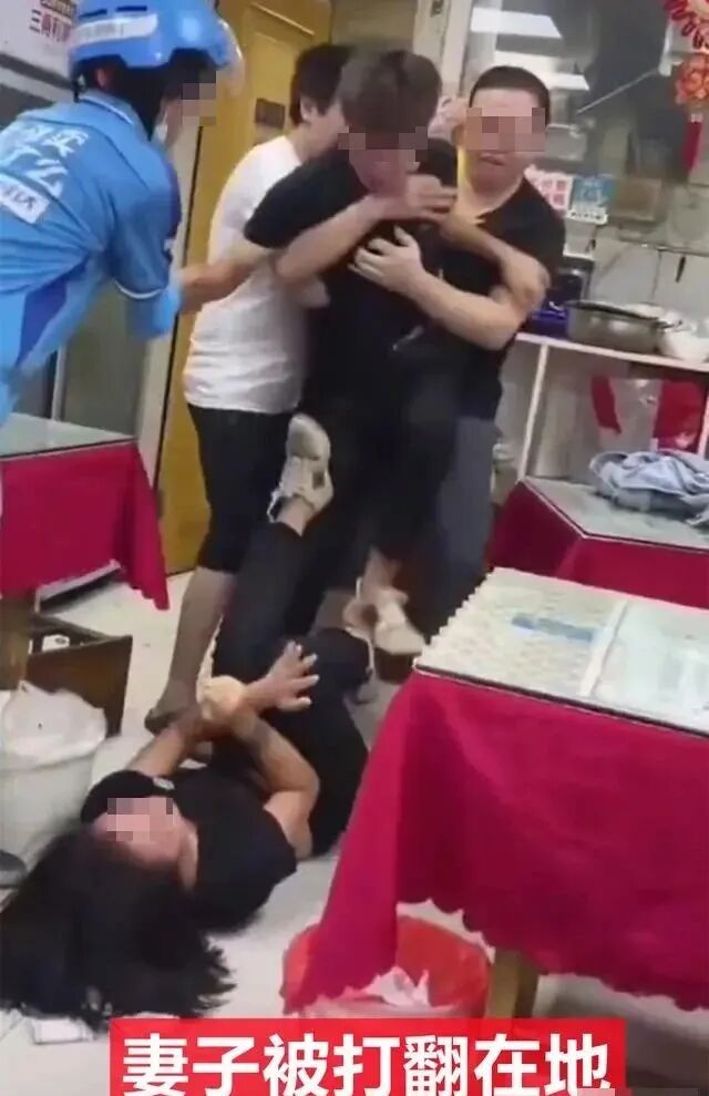 在饭店老板和邻座食客的劝解之下,夫妻两人终于被拉开。丈夫仍然没有消气,质问妻子:”你不是出来吃饭的吗?为什么坐在别人腿上?”