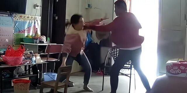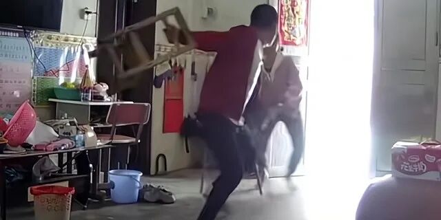 而她的丈夫在面对妻子时也没有选择退让,而是在妻子拎起椅子的瞬间就摆出了防御的架势与妻子扭打在一起。