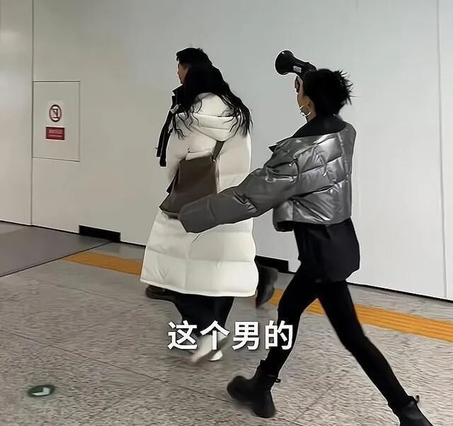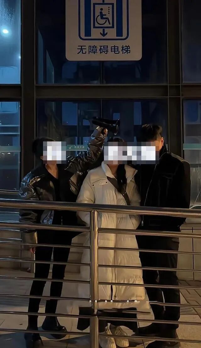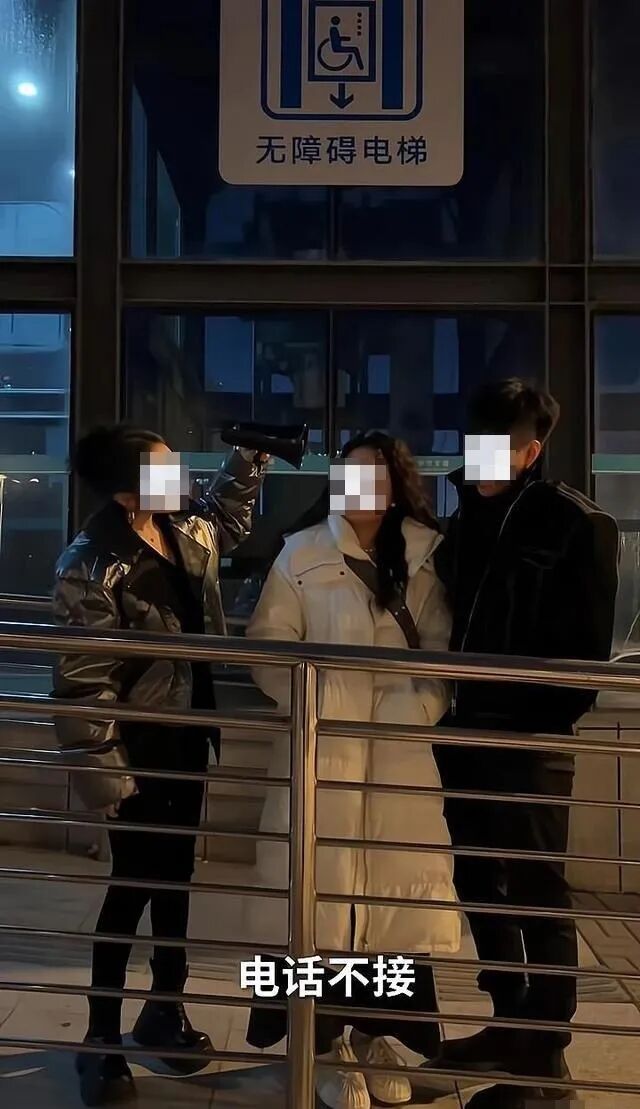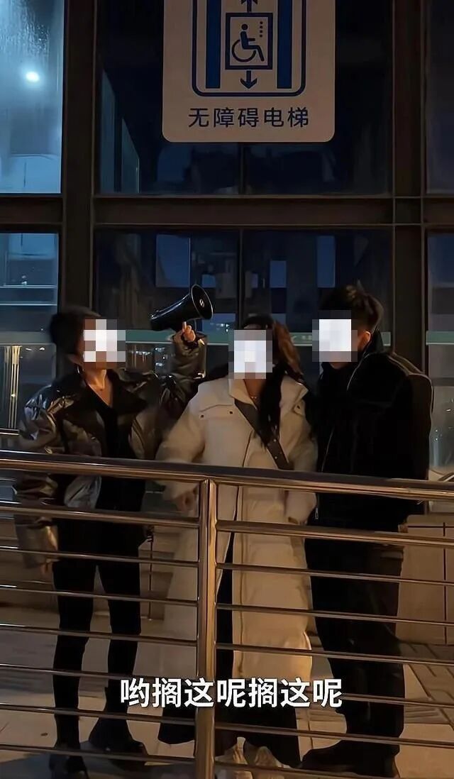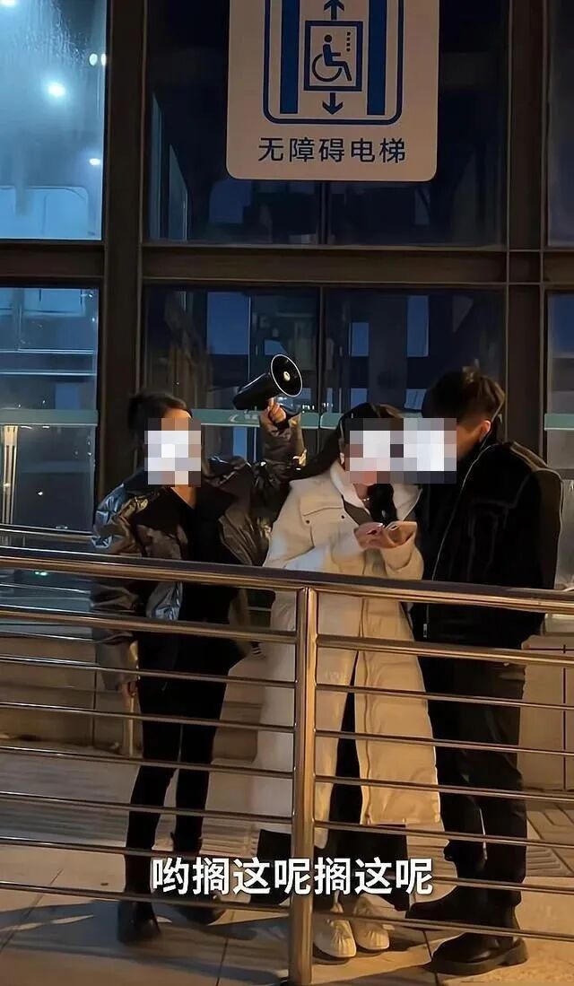 情侣模样的两人,面对女子的行为,并没有做出太多的表示,只是一语不发,随女子拿着喇叭继续喊: