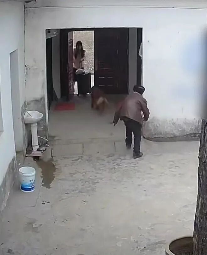 老人无奈只好转身回到院落之中找人,期间家里面养的大黄狗也冲了出来阻挠女子进入家门!