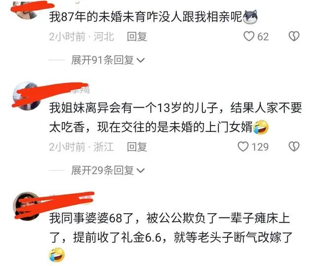 有网友评论说,我87年的,未婚未育,为什么没有人排队跟我相亲呢?