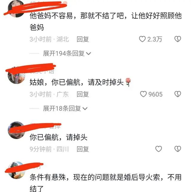 也还有网友评论说,条件太过悬殊,现在的问题就是婚后矛盾的导火索,务必慎重。