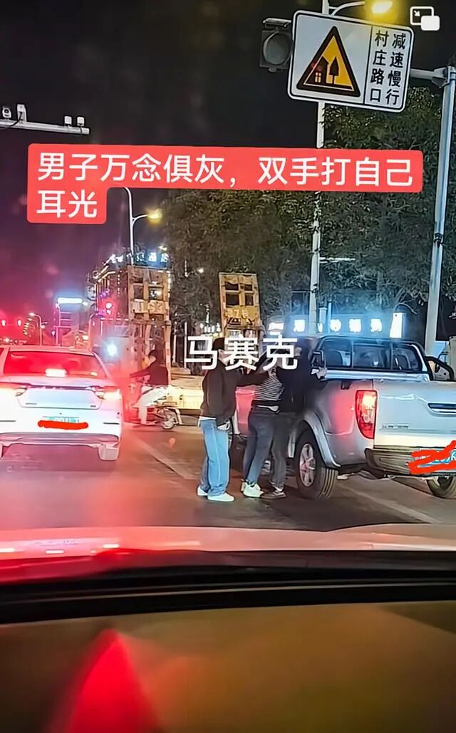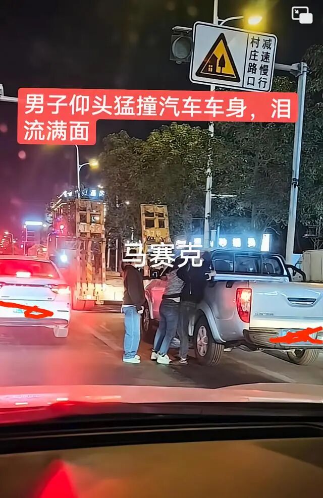 他的脸上露出万念俱灰的神色,刹那间满脸泪水,一边轻轻摇头,一边抬起双手,猛打自己的脸,随后,男子又仰头撞向自己的汽车,仿佛一副痛不欲生的样子。