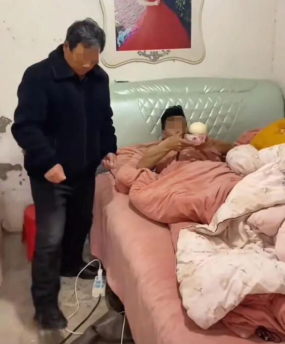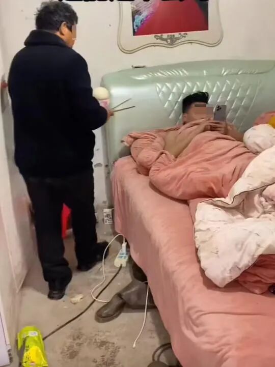 再看看公公还要给床上的儿子端饭的场景,更让女子无法言说,父母养儿,是要儿子照顾孝顺自己的,结果公公都70多岁了,竟然还要给30多岁的儿子端饭吃。