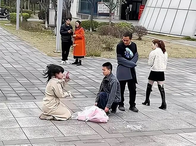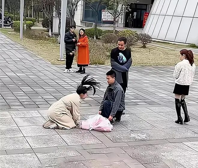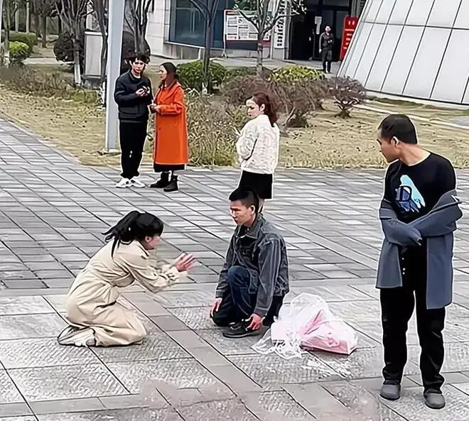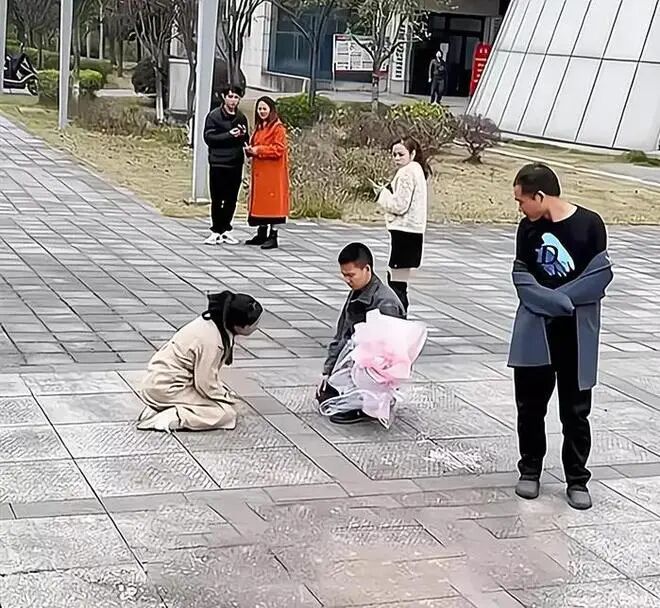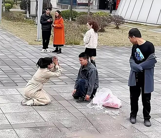 就在围观的人群以为两人会和电视剧的情节一样女子含羞答应,二人相拥接受大家的祝福的时候,被求爱的女子忽然双膝跪地朝男子疯狂磕头。
