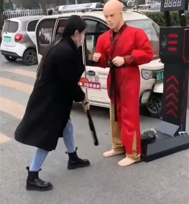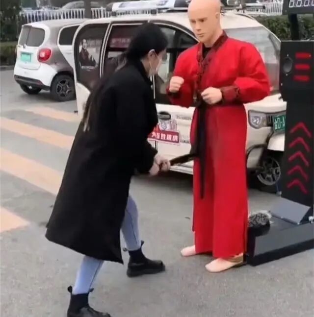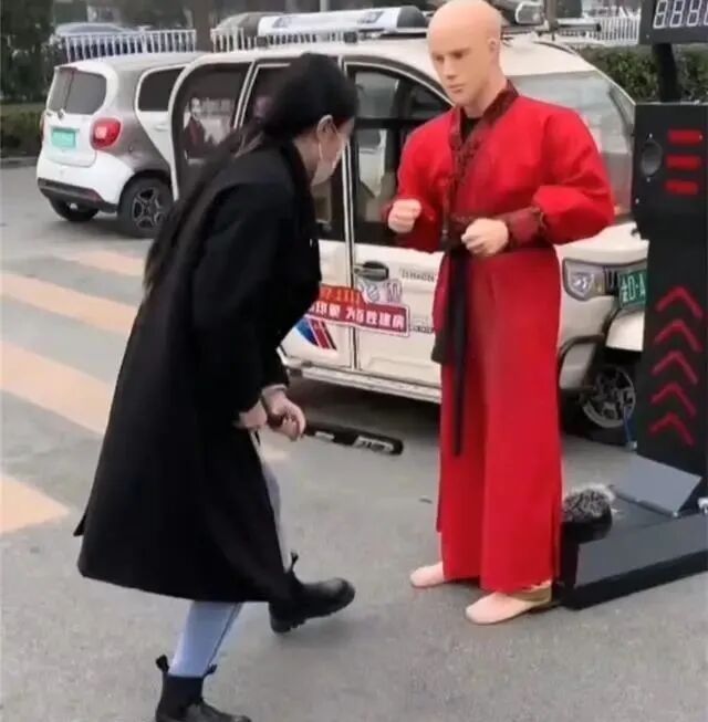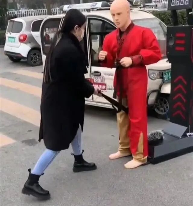 只见在马路上立着一个穿着红衣服的功夫假人,大多数的人都只是简单瞟一眼就离开了,有的则是上前假装打个招呼或者用手摸几下作罢,而一个穿着黑色大衣的女子则是表现出了异常的兴趣,她的一番举动直接让路人汗颜。