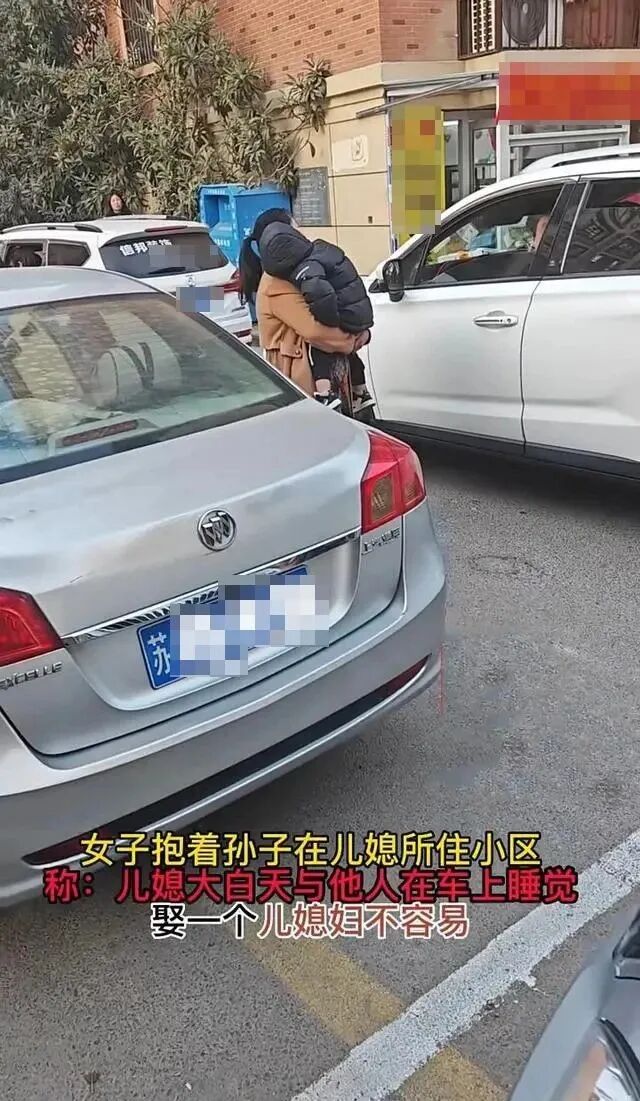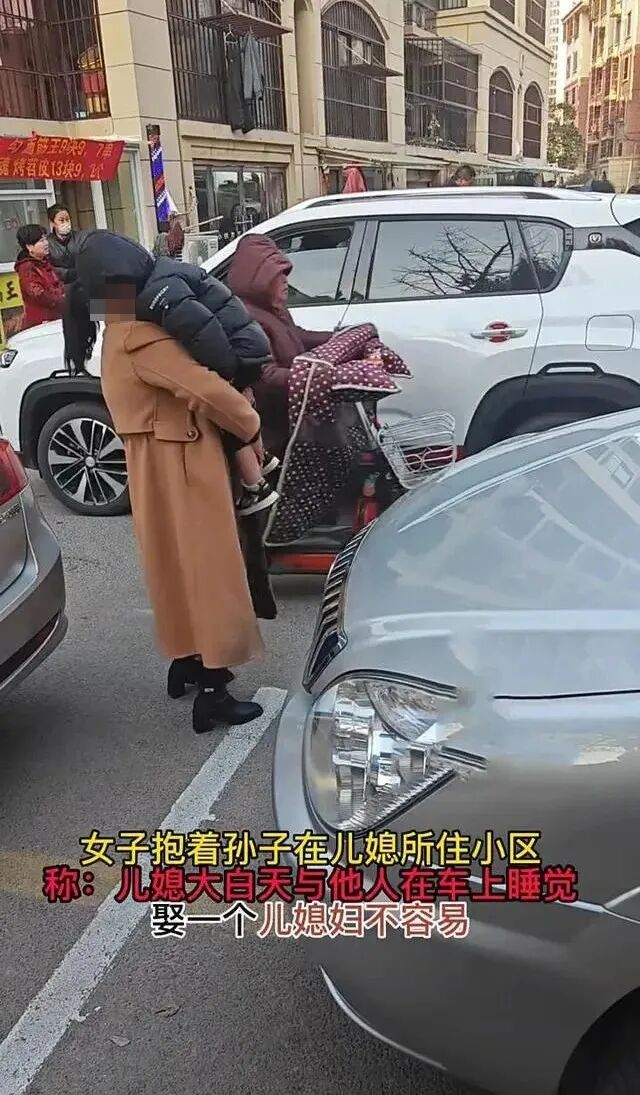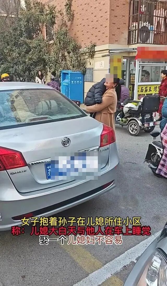没想到,儿媳妇大白天,和男的在车里约会,于是婆婆就抱着孙子,在儿媳妇住的小区里,对着围观的人诉说自己的不幸:
