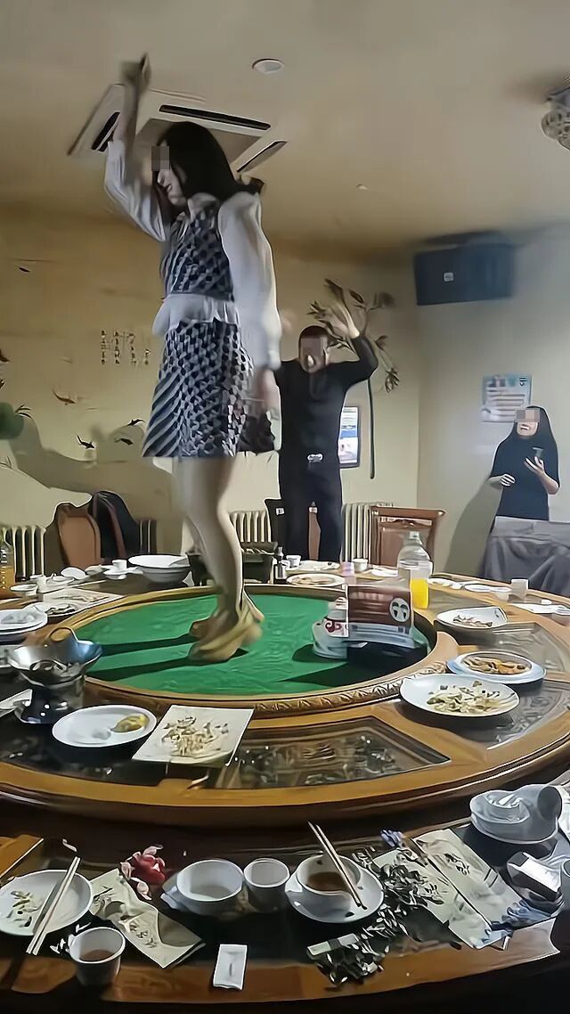 在一间饭店包厢内,一场同学聚会上,一位女子直接跳到桌子上,疯狂的舞动着自己的身体,让现场的气氛到达了高潮。
