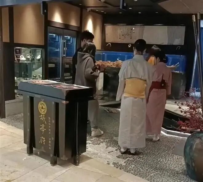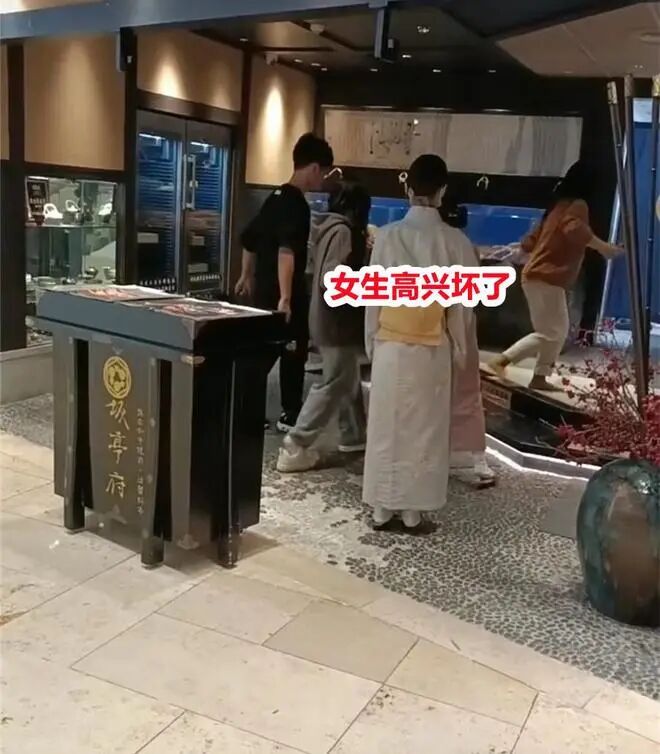 随后女生和闺蜜带着男生来到了商场顶楼,指着一家日料店说:“听朋友推荐这家店的口碑还不错,要不我们去试试吧。”