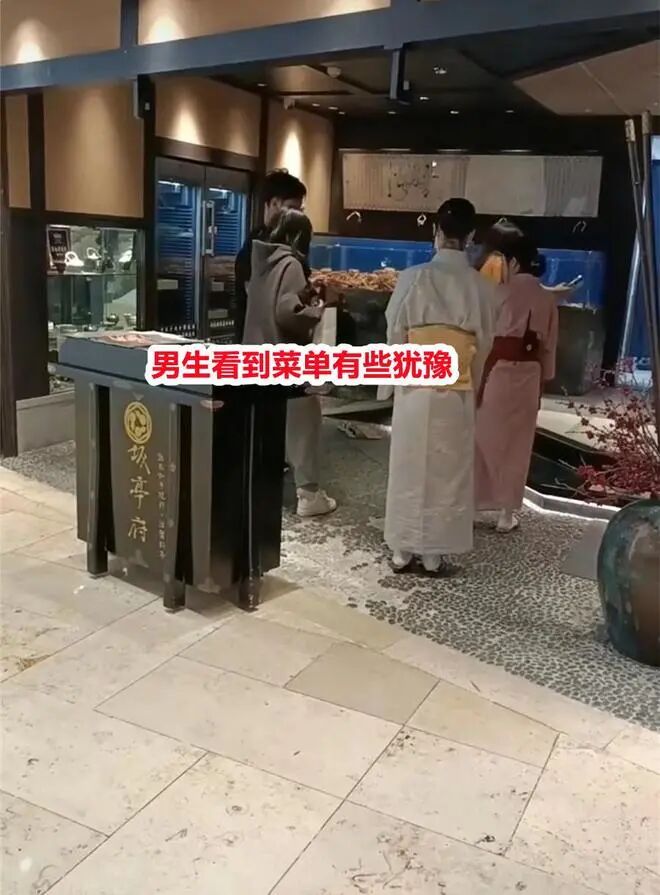 双方在门口停留半天后,男生考虑到已经到了店门口,并且菜单已经拿在手上了,如果这个时候自己提出换地方,显得有点小气了,肯定会被女生瞧不起,所以最后只好硬着头皮表示:“没事,赶紧进去吧。”