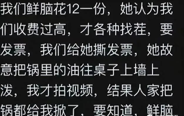 说实话,看到价格我笑了,我以为能让女子发这么大火的脑花,最起码也要几十块往上,而实际上这家店铺一份的话只要12元,对比于昆明一份烤脑花要25元,山东一份冻脑花一份要15~20原来说,这个价格真的是很良心了,但这么良心的价格却换来了女子不顾他人危险,不顾自己危险的掀翻桌上滚烫的火锅差点酿成火灾,真不知道该怎么形容他了?除此之外,老板娘还曝光了,事发后的一件危险的事。