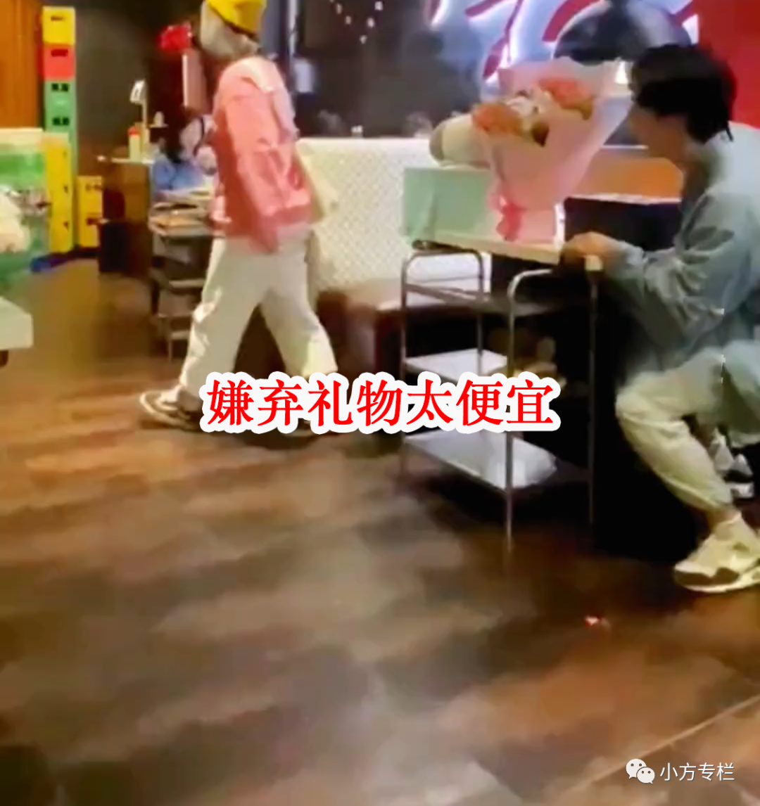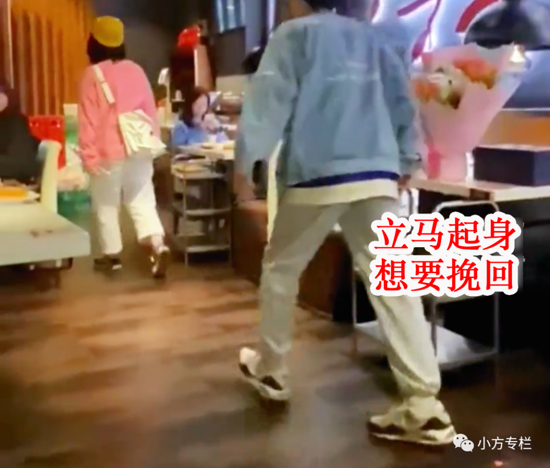 最后更是一气之下把男友送的花砸在地上,饭也不吃了,直接起身就走了,男子明显是不想轻易放弃这段感情,马上起身追了上去。