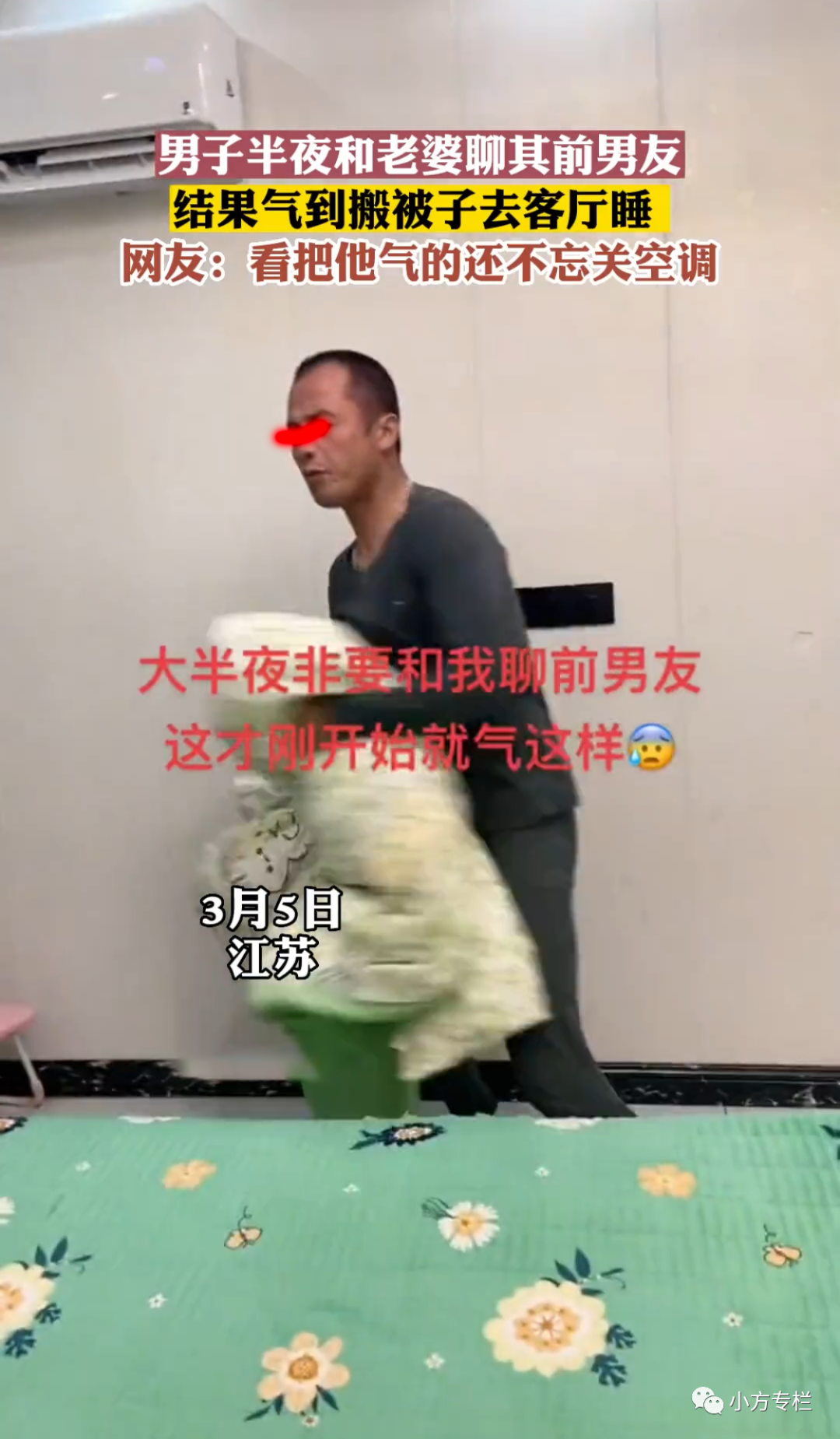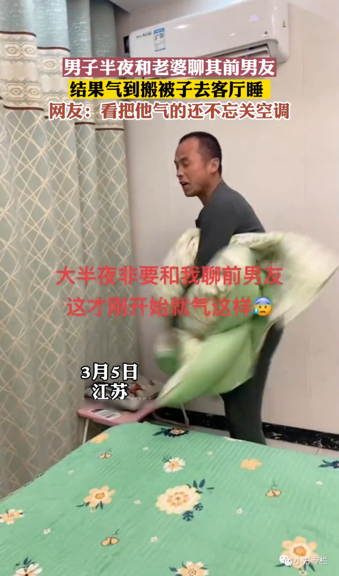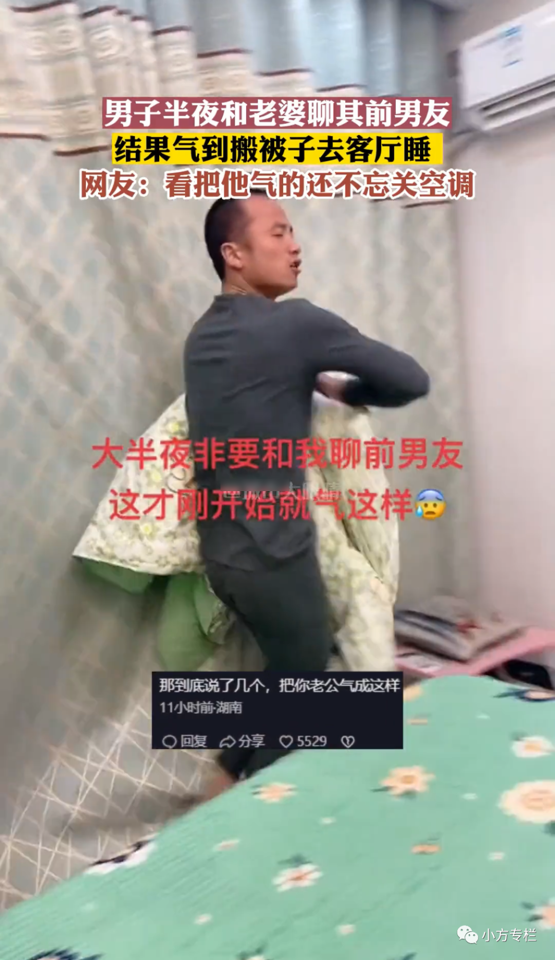 说完丈夫就直接起身,抱着自己的被子就要出去睡,不想再跟妻子睡了,虽然没有说什么但丈夫明显就是介意。