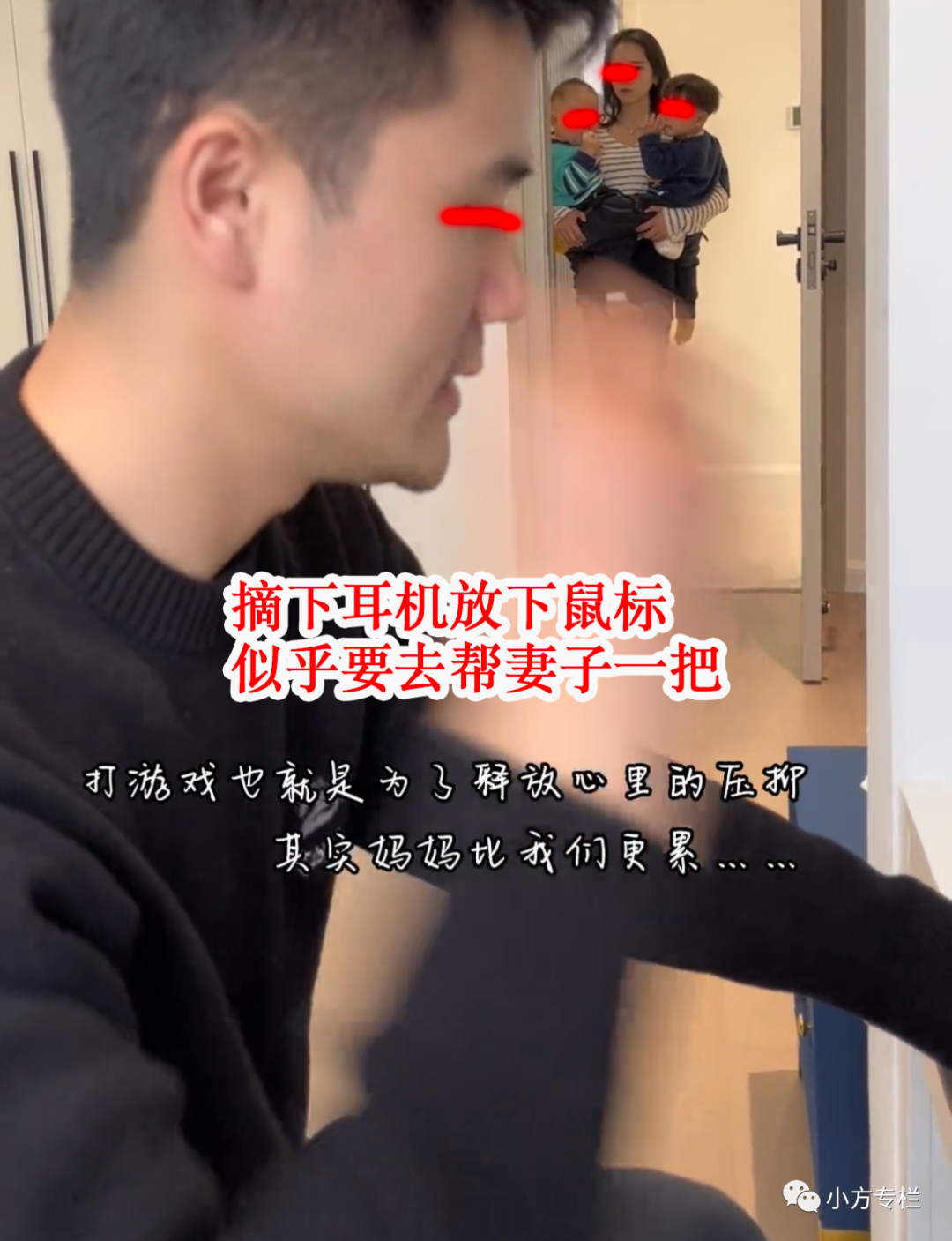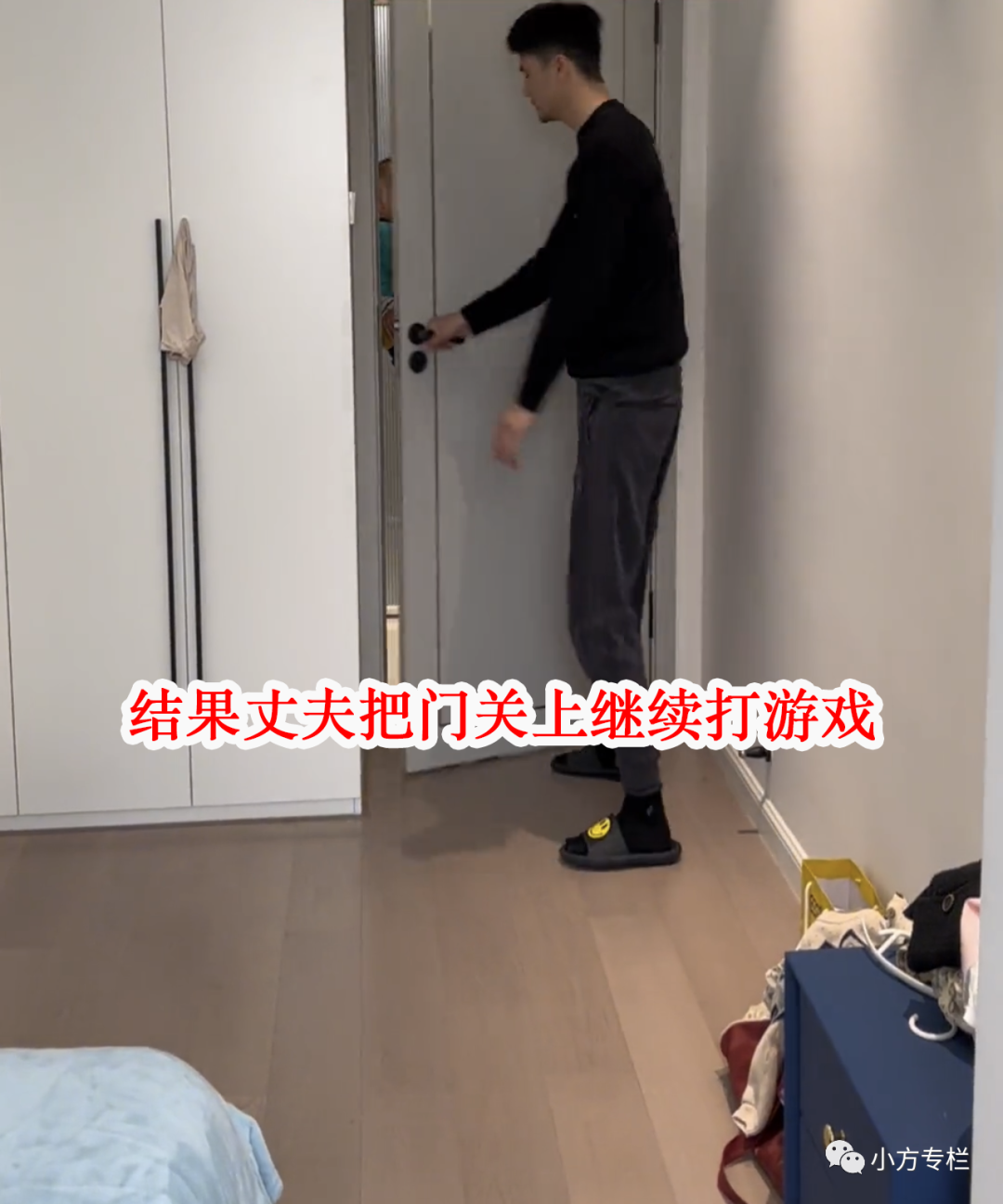 而正在打游戏的男子就是孩子的爸爸,也就是这个美女的丈夫,虽然妻子站在门口没有说什么,但是那一脸不善的表情已经足够说明一切了。
