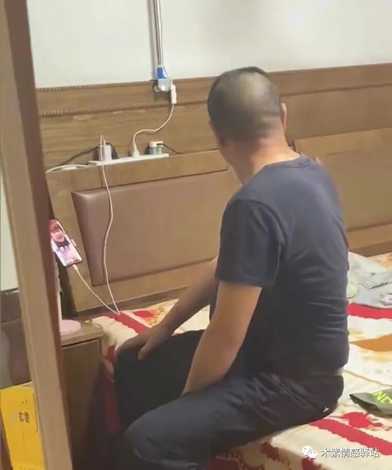一名中年男子,端坐在床沿,他肤色黝黑,看起来心情沉重,在床头上,摆放着一个正在充电的手机,手机屏幕上,一名年轻女子,笑意盈盈和男子对视。