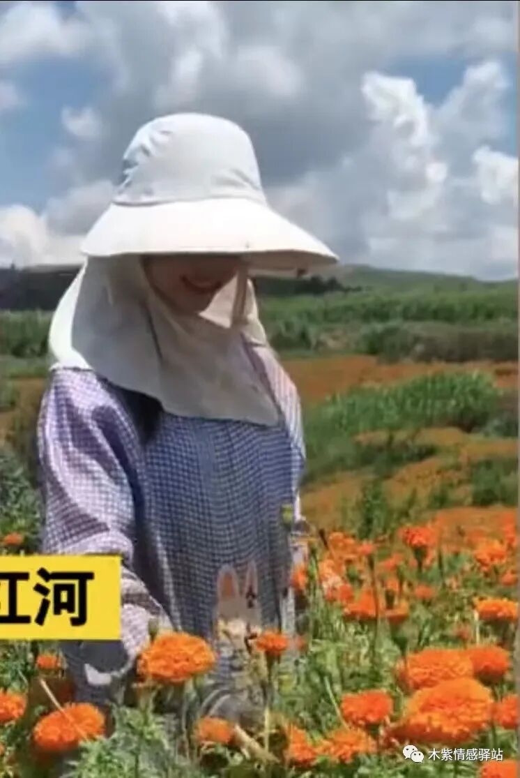 一名女子穿着肥大的细小格子罩衣,戴着大大的遮阳帽,女子双手戴着手套,动作麻利地干着农活,她的面前是开得正旺的那种红花(一种晒干后可以入药的药材)。