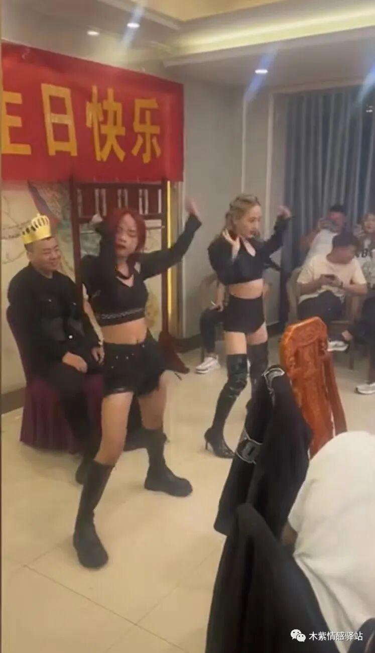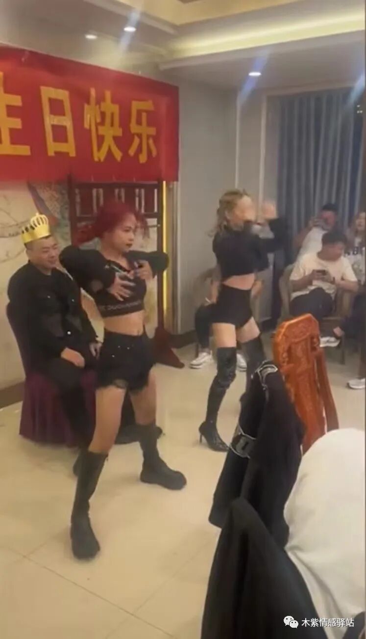 这些还不够,妻子竟然还请来了两位年轻的舞女,在现场即兴表演了两场热舞,两名女子穿着有些暴露的服装,化着浓妆,同时做出吸引人的各种动作,一下子把全场的气氛提升到了异常热烈的程度。